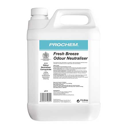 Prochem Fresh Breeze is a concentrated odour neutraliser and deodoriser for use on carpets and fabrics to quickly eliminate bad odours. It is free from biocides, making it an environmentally friendly choice. It can be used in a number of cleaning applications to remove bad smells and odours from carpets, fabrics and most wet-cleanable surfaces.