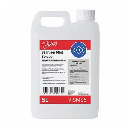 The Victor Mist Pro 360 Machine disinfects the air and all surfaces. It is 99.999% effective in inactivating and destroying pathogens when using complete Mist Pro 360 System. The system comprises of the Mist pro 360 unit applying the V-SMS5 Victor Sanitiser Mist Solution. The V-SMS5 Victor Sanitiser Mist Solution Meets the requirements of EN1276, EN1650, EN13697 and EN14476.